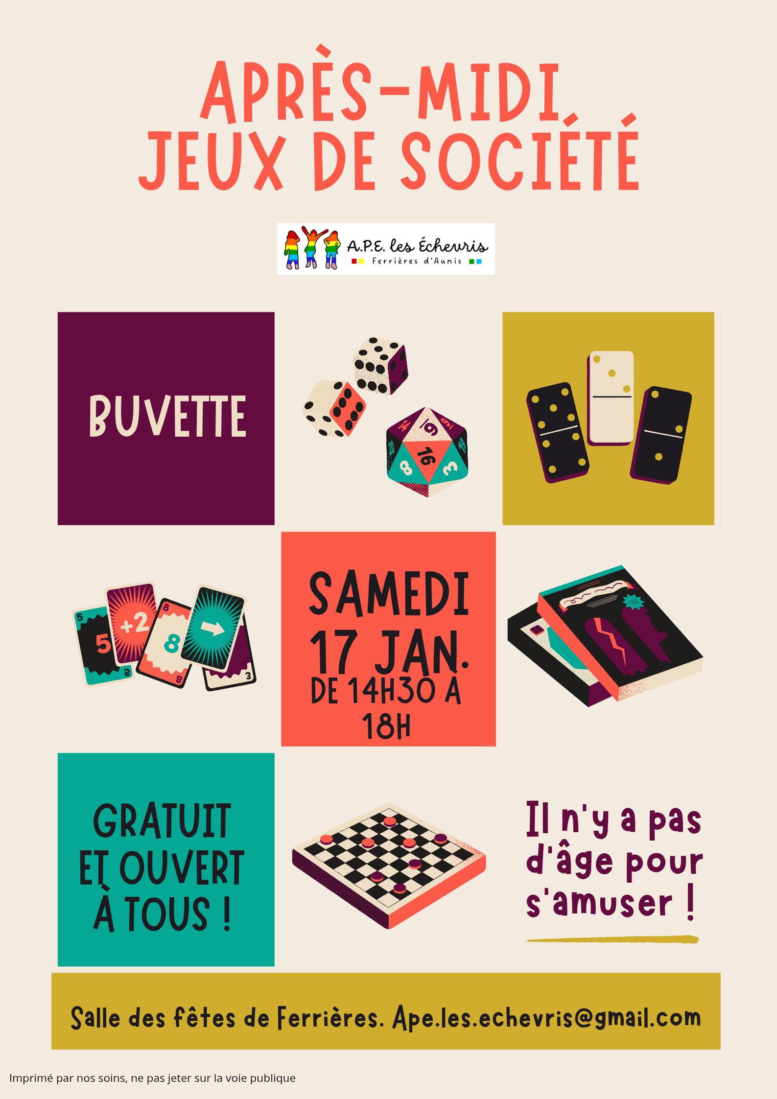 Nous sommes contentes de vous annoncer que nous organisons un après-midi jeux de société le samedi 17 janvier, à la salle des fêtes de Ferrières. 🗓️